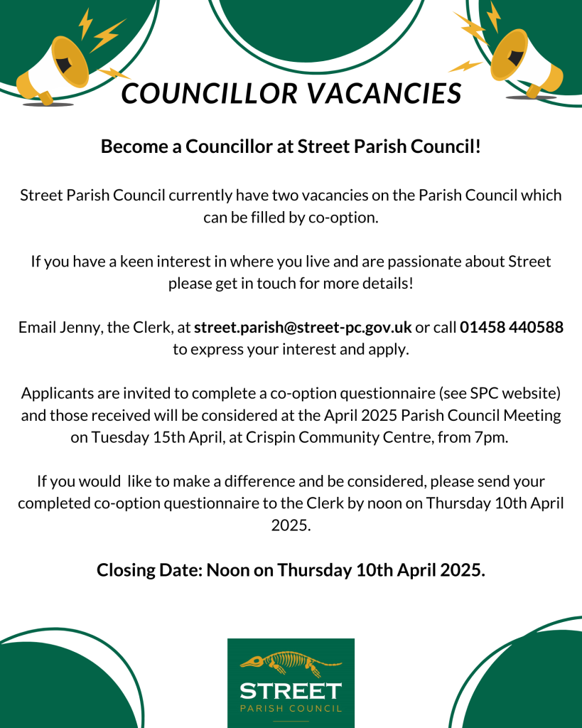 Street Parish Council currently have two vacancies on the Parish Council which can be filled by co-option.